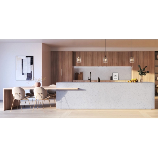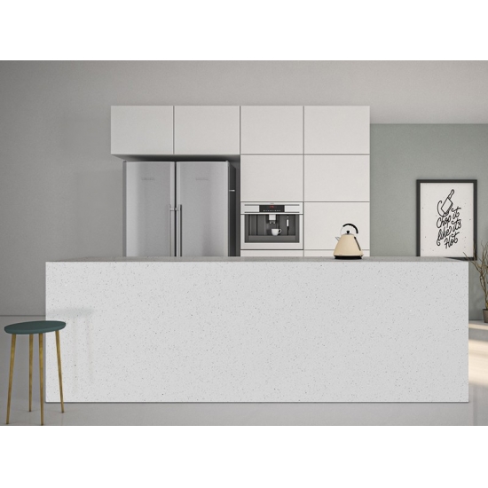 1001 Sparkle White Quartz presents a pristine, luminous appearance with its bright white base delicately interlaced with sparkling mineral flecks. The surface radiates elegance, as the subtle shimmer catches the light from every angle, adding a sense of depth and sophistication. This quartz is designed to enhance any space with a clean, refined look, making it perfect for modern countertops, vanities, and feature surfaces.