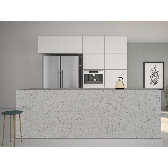 Amazon Beige Quartz White is a specially treated artificial quartz stone that differs from other series in that it has a more sparkling appearance. these Quartz impart a sense of depth and texture when installed on the walls, Flooring, Countertops etc. They can be used to create stunning wall pieces and basin backsplashes in your bathrooms and kitchen. These Quartz work extremely well in areas that remain in contact with moisture owing to their germ-free and moisture resistance properties.