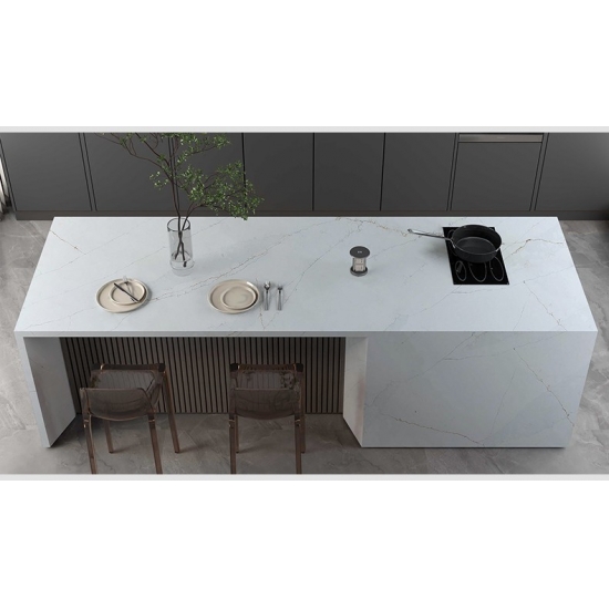 5001 Calacatta Ethereal Quartz presents a refined, elegant look with its soft white base delicately veined in subtle grey and gold tones. The surface radiates sophistication, as the gentle veins create a natural sense of flow and movement across the slab. This quartz is designed to bring timeless beauty and understated luxury, enhancing the ambiance of any space it adorns.