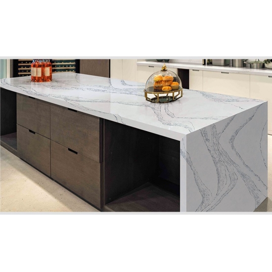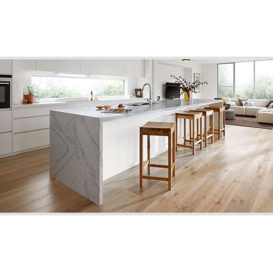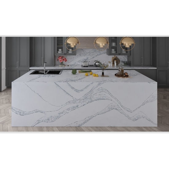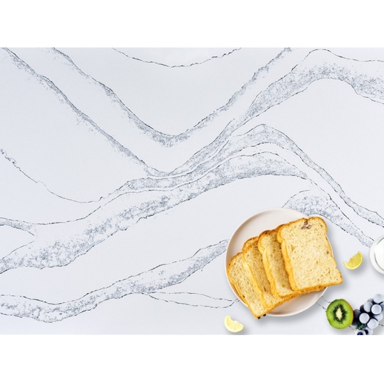 5004 Brittanicca Quartz Slab presents a bold and dynamic character, defined by a deep charcoal background dramatically swept by intense, luminous white veining. The high-contrast movement creates a striking visual impact and a powerful sense of depth. This slab offers a modern, dramatic statement, ideal for creating focal points in contemporary interiors and adding a layer of captivating luxury to any design.