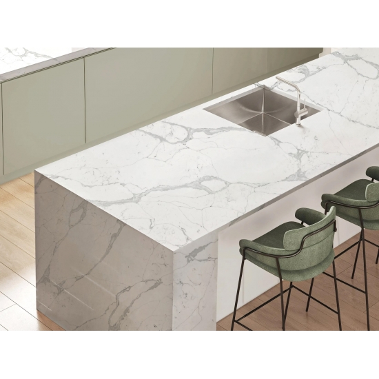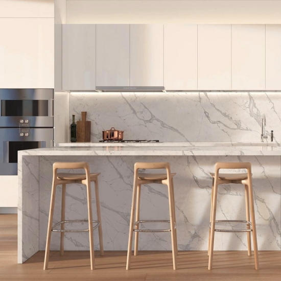 The Calacatta series quartz is currently the most popular quartz stone product.Exquisite and unique,Calacatta Quartz stuns the senses with its clean whites and striking through-body marble look veining.With its beautiful striking wide vein pattern and luxurious feel. This quartz offers the natural look of the Calacatta marble, but with none of the drawbacks that come with marble worktops. Calacatta quartz is a very durable worktop that is stain and scratch resistant meaning it is also a very practical choice for kitchen and bathroom countertops, stairs, window sills, custom furniture, interior, exterior wall and floor applications, water jet pattern and other design projects.