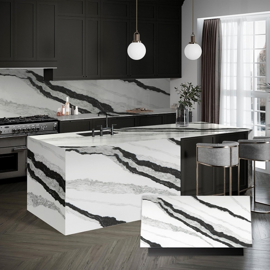 Exquisite and unique,Calacatta Quartz stuns the senses with its clean whites and striking through-body marble look veining.With its beautiful striking wide vein pattern and luxurious feel. This quartz offers the natural look of the Calacatta marble, but with none of the drawbacks that come with marble worktops. Calacatta quartz is a very durable worktop that is stain and scratch resistant meaning it is also a very practical choice for kitchen and bathroom countertops, stairs, window sills, custom furniture, interior, exterior wall and floor applications, water jet pattern and other design projects.