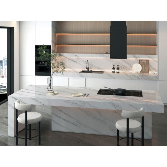 5044 Volakas White Calacatta Quartz is ideal for a variety of applications, thanks to its timeless elegance and versatile design. This polished quartz is commonly used for kitchen countertops, bathroom vanities, and backsplashes, where its clean white surface with soft gray veining adds a touch of sophistication. It’s also perfect for wall cladding and flooring in both residential and commercial spaces.