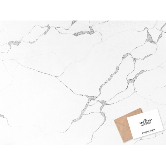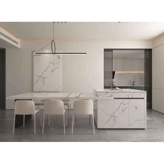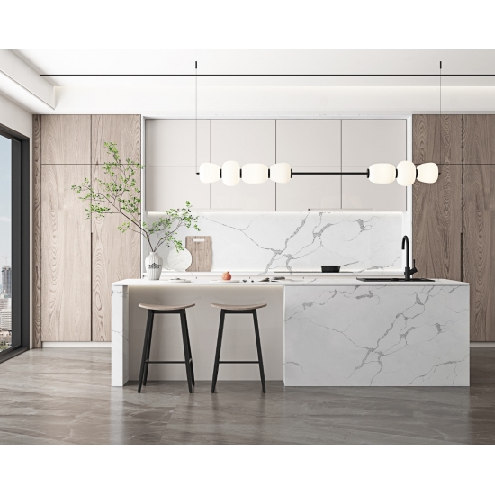 The Calacatta series quartz is currently the most popular quartz stone product.Exquisite and unique,Calacatta Quartz stuns the senses with its clean whites and striking through-body marble look veining.With its beautiful striking wide vein pattern and luxurious feel. This quartz offers the natural look of the Calacatta marble, but with none of the drawbacks that come with marble worktops. Calacatta quartz is a very durable worktop that is stain and scratch resistant meaning it is also a very practical choice for kitchen and bathroom countertops, stairs, window sills, custom furniture, interior, exterior wall and floor applications, water jet pattern and other design projects.