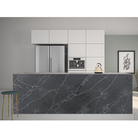 5128 Fior Bosco Quartz showcases a sophisticated gray canvas, elegantly traced with delicate, organic veining that evokes the serene beauty of a forest landscape. Each slab presents a unique composition of tonal depth and fluid movement, bringing a modern and atmospheric tranquility to any interior. Its luminous surface enhances light reflection, creating a dynamic visual flow perfect for kitchen countertops, bathroom vanities, and feature walls.