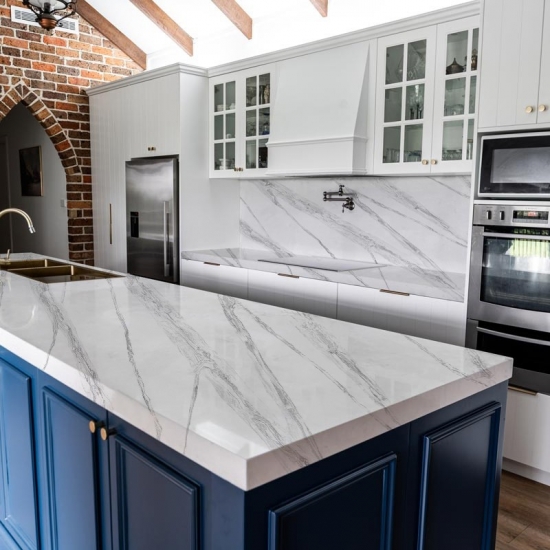 The Calacatta series quartz is currently the most popular quartz stone product.Exquisite and unique,Calacatta Quartz stuns the senses with its clean whites and striking through-body marble look veining.With its beautiful striking wide vein pattern and luxurious feel. This quartz offers the natural look of the Calacatta marble, but with none of the drawbacks that come with marble worktops. Calacatta quartz is a very durable worktop that is stain and scratch resistant meaning it is also a very practical choice for kitchen and bathroom countertops, stairs, window sills, custom furniture, interior, exterior wall and floor applications, water jet pattern and other design projects.