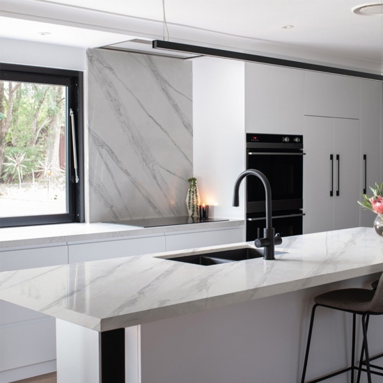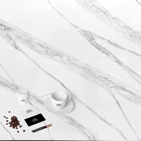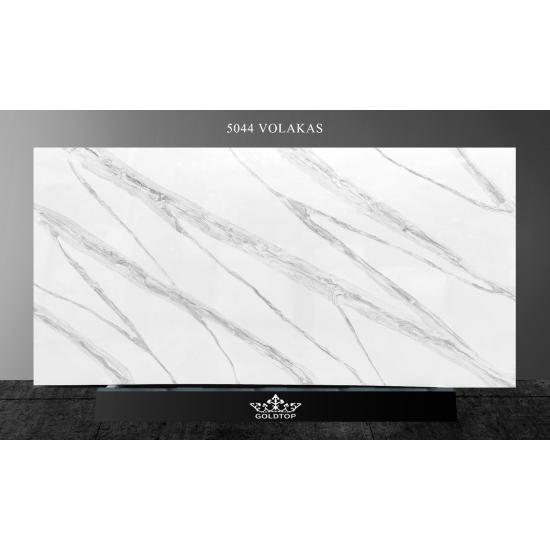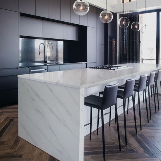 Exquisite and unique,Calacatta Quartz stuns the senses with its clean whites and striking through-body marble look veining.With its beautiful striking wide vein pattern and luxurious feel. This quartz offers the natural look of the Calacatta marble, but with none of the drawbacks that come with marble worktops. Calacatta quartz is a very durable worktop that is stain and scratch resistant meaning it is also a very practical choice for kitchen and bathroom countertops, stairs, window sills, custom furniture, interior, exterior wall and floor applications, water jet pattern and other design projects.