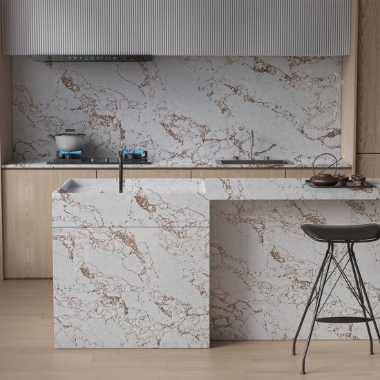 The Calacatta series quartz is currently the most popular quartz stone product.Exquisite and unique,Calacatta Quartz stuns the senses with its clean whites and striking through-body marble look veining.With its beautiful striking wide vein pattern and luxurious feel. This quartz offers the natural look of the Calacatta marble, but with none of the drawbacks that come with marble worktops. Calacatta quartz is a very durable worktop that is stain and scratch resistant meaning it is also a very practical choice for kitchen and bathroom countertops, stairs, window sills, custom furniture, interior, exterior wall and floor applications, water jet pattern and other design projects.