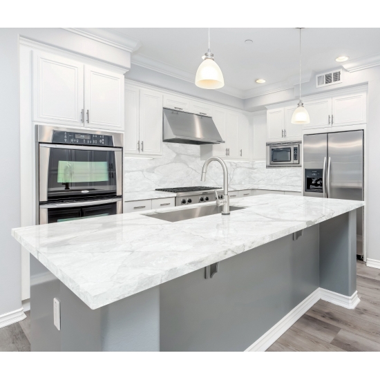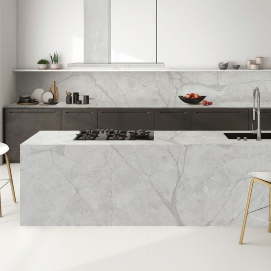 The Calacatta series quartz is currently the most popular quartz stone product.Exquisite and unique,Calacatta Quartz stuns the senses with its clean whites and striking through-body marble look veining.With its beautiful striking wide vein pattern and luxurious feel. This quartz offers the natural look of the Calacatta marble, but with none of the drawbacks that come with marble worktops. Calacatta quartz is a very durable worktop that is stain and scratch resistant meaning it is also a very practical choice for kitchen and bathroom countertops, stairs, window sills, custom furniture, interior, exterior wall and floor applications, water jet pattern and other design projects.