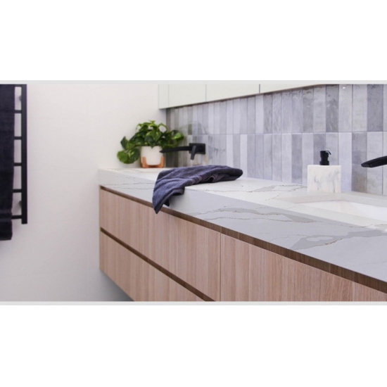 5057 Unique Marble Quartz showcases a bold and artistic character, with a striking dark base dramatically interlaced with vibrant white and gold veining. The intense contrast creates a dynamic, one-of-a-kind visual impact. This slab makes a powerful statement, ideal for creating a focal point in contemporary and luxurious interiors.
