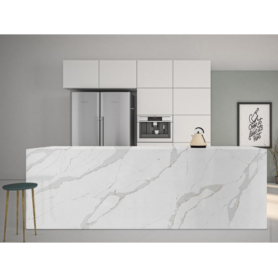 Calacatta Quartz is made from natural components, but strong, durable and low-porosity, which makes stone products made of quartz practically wear-free. Durability, comfort and consistent pattern are the main reasons for the growing popularity of quartz stone. Quartz stone is 90% natural stone, the rest is glue, dyes and additives that improve the technical properties of the stone.Water permeability and stain resistance complements the beauty of quartz stone.