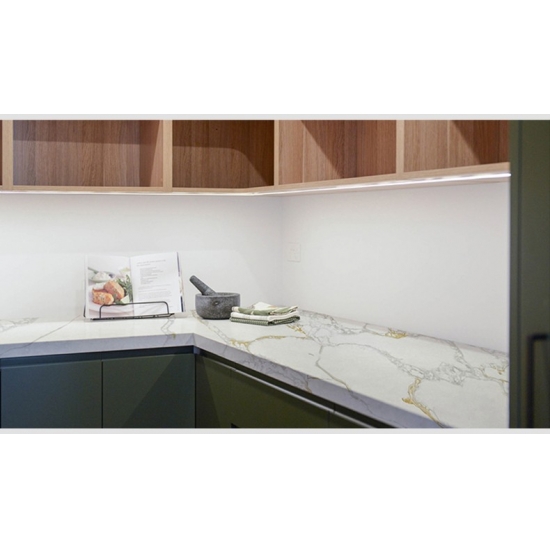 5058 Calacatta Ocean Quartz features a striking white base contrasted by bold, dramatic grey veining. The dynamic flow of the patterns creates a sense of depth and movement, evoking the power of the ocean. This slab makes a luxurious and modern statement, ideal for creating a focal point in contemporary interiors.