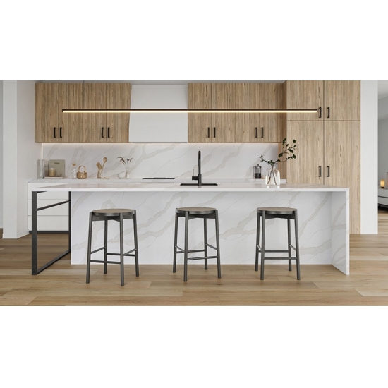 5059 Calacatta Paris Quartz features a bright white base enhanced by bold, dramatic grey veining. The striking contrast creates a dynamic and luxurious visual impact. This slab embodies modern elegance, perfect for making a sophisticated statement in any interior space.
