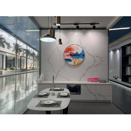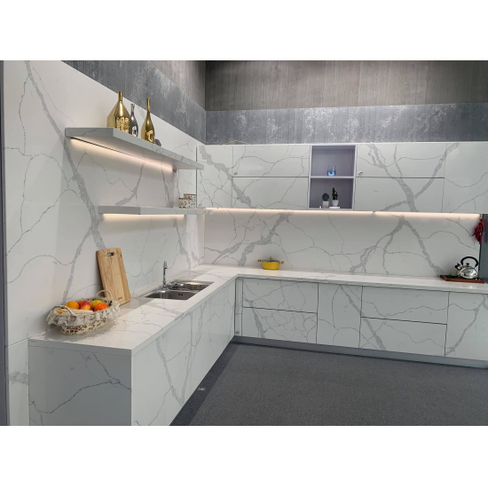 5044 Volakas White Calacatta Quartz is ideal for a variety of applications, thanks to its timeless elegance and versatile design. This polished quartz is commonly used for kitchen countertops, bathroom vanities, and backsplashes, where its clean white surface with soft gray veining adds a touch of sophistication. It’s also perfect for wall cladding and flooring in both residential and commercial spaces.