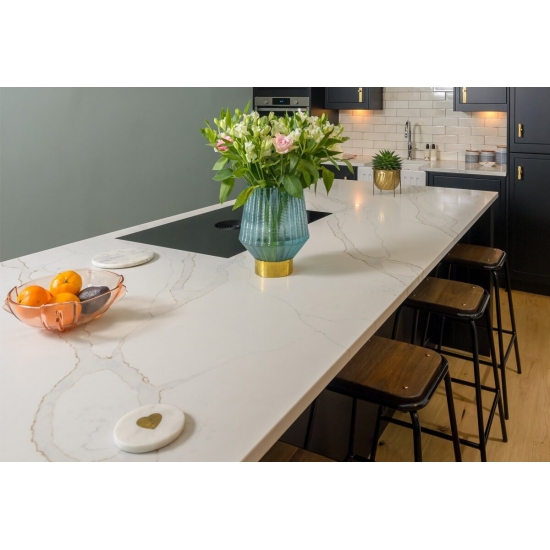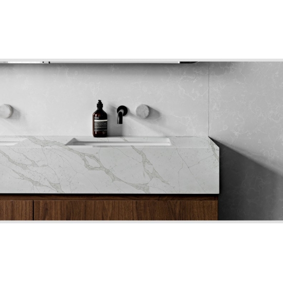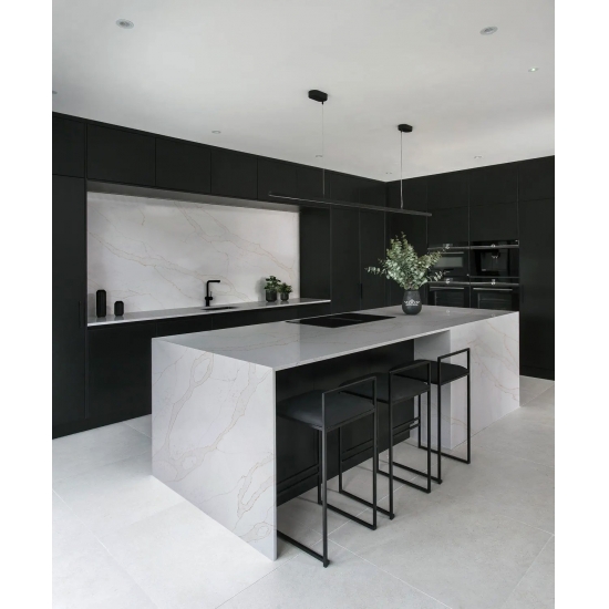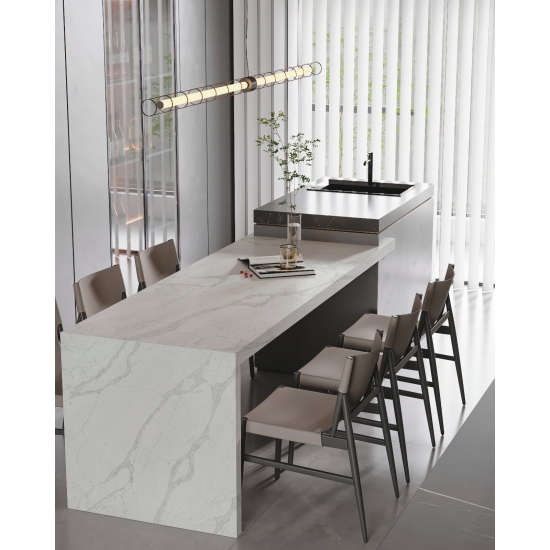 5063 Verona Calacatta Quartz, as a zero-silica quartz, offers a healthier and more sustainable option for surfaces, especially in kitchens and bathrooms. Its non-silica composition makes it safer for installation and reduces health risks associated with silica dust exposure. The elegant Calacatta veining provides a luxurious marble-like appearance, while its durable, non-porous surface ensures resistance to stains, scratches, and heat. This makes it an excellent choice for high-traffic areas, combining beauty, safety, and low maintenance.