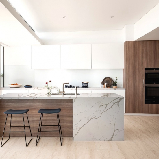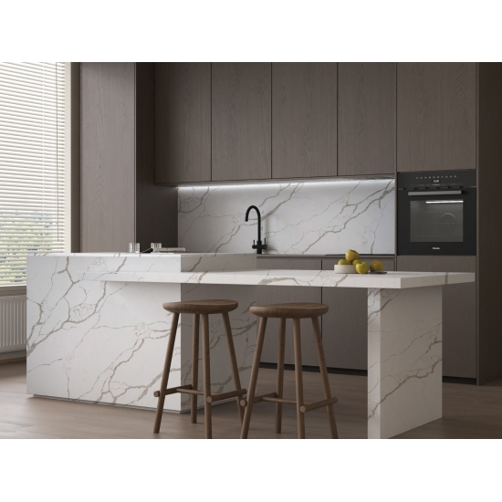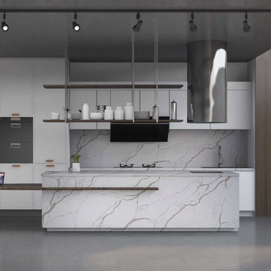The Calacatta series quartz is currently the most popular quartz stone product.Exquisite and unique,Calacatta Quartz stuns the senses with its clean whites and striking through-body marble look veining.With its beautiful striking wide vein pattern and luxurious feel. This quartz offers the natural look of the Calacatta marble, but with none of the drawbacks that come with marble worktops. Calacatta quartz is a very durable worktop that is stain and scratch resistant meaning it is also a very practical choice for kitchen and bathroom countertops, stairs, window sills, custom furniture, interior, exterior wall and floor applications, water jet pattern and other design projects.