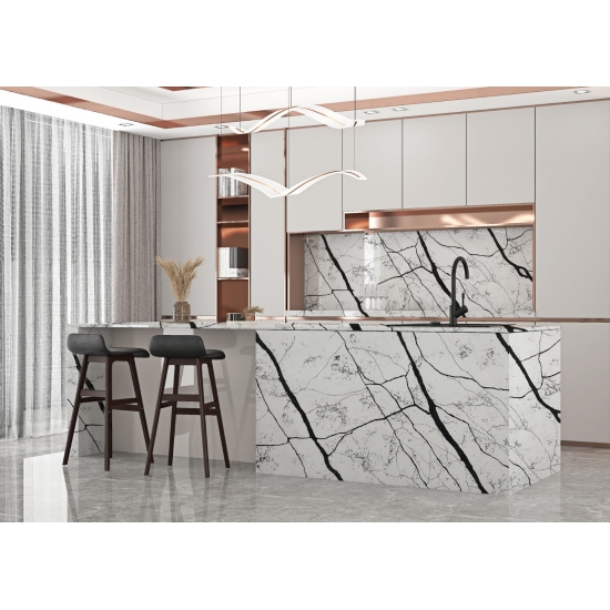 5044 Volakas White Calacatta Quartz is ideal for a variety of applications, thanks to its timeless elegance and versatile design. This polished quartz is commonly used for kitchen countertops, bathroom vanities, and backsplashes, where its clean white surface with soft gray veining adds a touch of sophistication. It’s also perfect for wall cladding and flooring in both residential and commercial spaces.