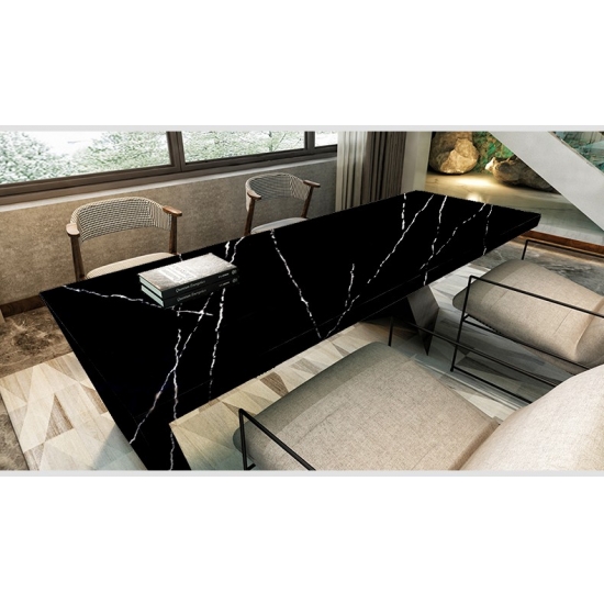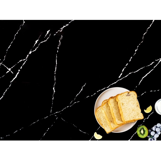 5074 Black Artwork features a bold black canvas dramatically enhanced by striking white veining. The high-contrast pattern creates a dynamic and artistic visual impact. This quartz slab delivers modern luxury and makes a powerful statement in any contemporary interior.