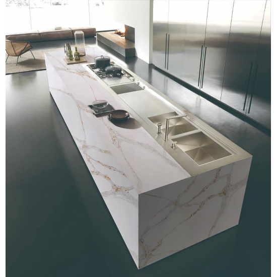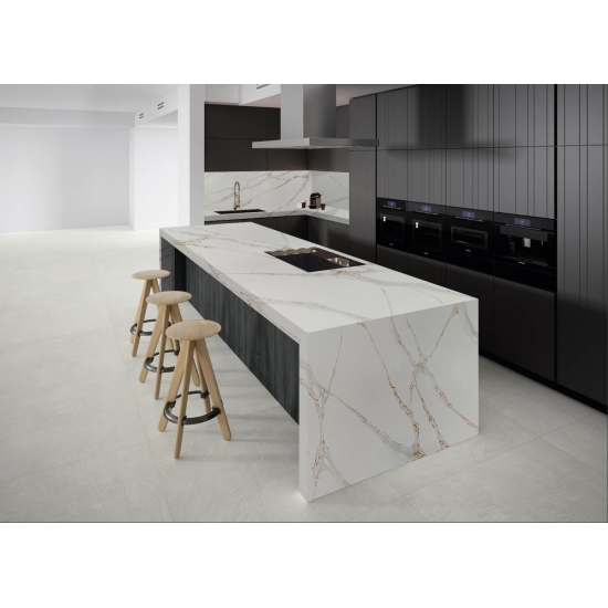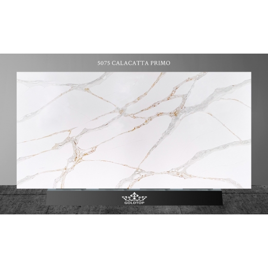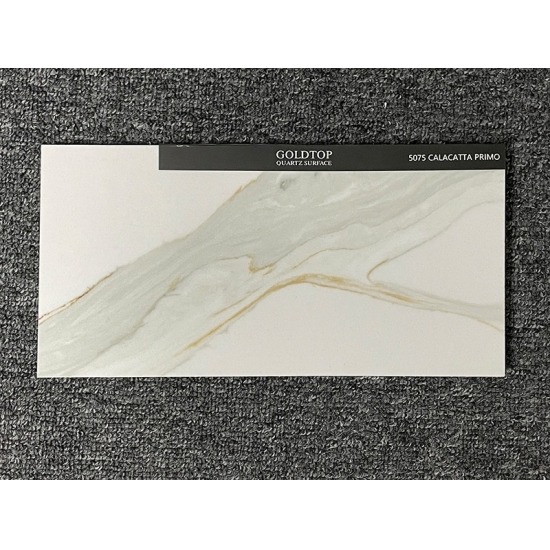 The Calacatta series quartz is currently the most popular quartz stone product.Exquisite and unique,Calacatta Quartz stuns the senses with its clean whites and striking through-body marble look veining.With its beautiful striking wide vein pattern and luxurious feel. This quartz offers the natural look of the Calacatta marble, but with none of the drawbacks that come with marble worktops. Calacatta quartz is a very durable worktop that is stain and scratch resistant meaning it is also a very practical choice for kitchen and bathroom countertops, stairs, window sills, custom furniture, interior, exterior wall and floor applications, water jet pattern and other design projects.