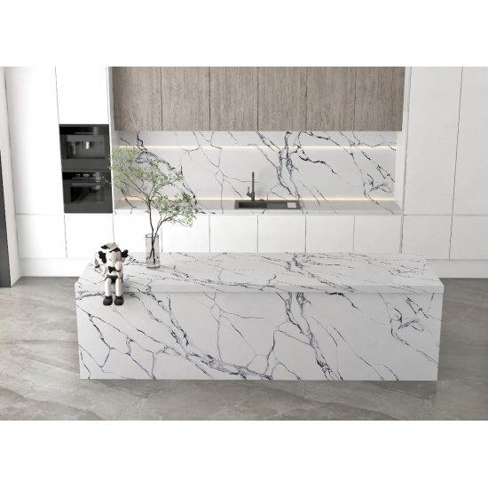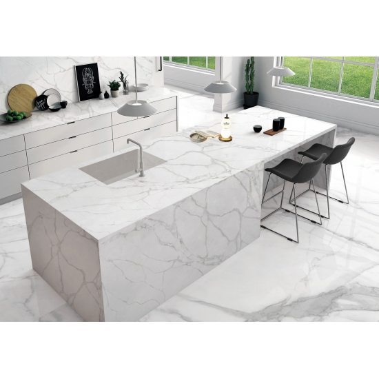 Exquisite and unique,Calacatta Quartz stuns the senses with its clean whites and striking through-body marble look veining.With its beautiful striking wide vein pattern and luxurious feel. This quartz offers the natural look of the Calacatta marble, but with none of the drawbacks that come with marble worktops. Calacatta quartz is a very durable worktop that is stain and scratch resistant meaning it is also a very practical choice for kitchen and bathroom countertops, stairs, window sills, custom furniture, interior, exterior wall and floor applications, water jet pattern and other design projects.