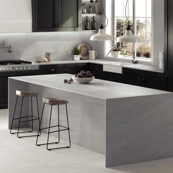 Exquisite and unique,Calacatta Quartz stuns the senses with its clean whites and striking through-body marble look veining.With its beautiful striking wide vein pattern and luxurious feel. This quartz offers the natural look of the Calacatta marble, but with none of the drawbacks that come with marble worktops. Calacatta quartz is a very durable worktop that is stain and scratch resistant meaning it is also a very practical choice for kitchen and bathroom countertops, stairs, window sills, custom furniture, interior, exterior wall and floor applications, water jet pattern and other design projects.