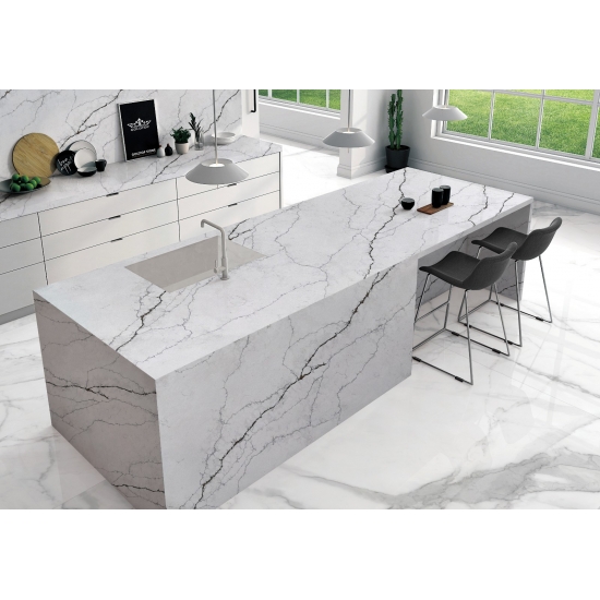 Exquisite and unique,Calacatta Quartz stuns the senses with its clean whites and striking through-body marble look veining.With its beautiful striking wide vein pattern and luxurious feel. This quartz offers the natural look of the Calacatta marble, but with none of the drawbacks that come with marble worktops. Calacatta quartz is a very durable worktop that is stain and scratch resistant meaning it is also a very practical choice for kitchen and bathroom countertops, stairs, window sills, custom furniture, interior, exterior wall and floor applications, water jet pattern and other design projects.