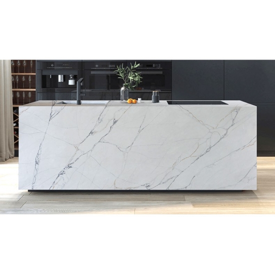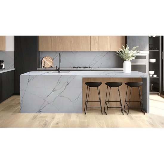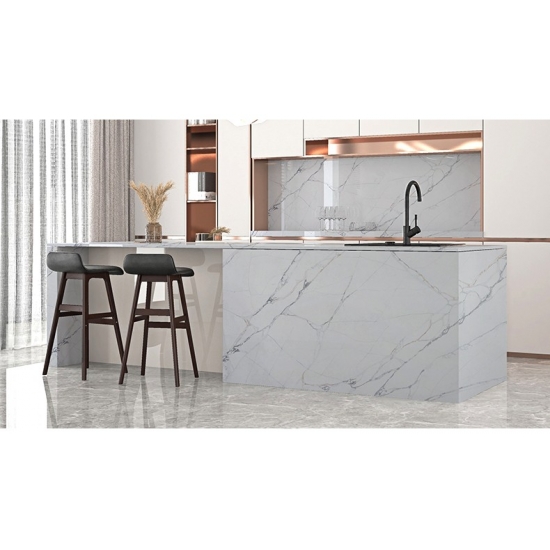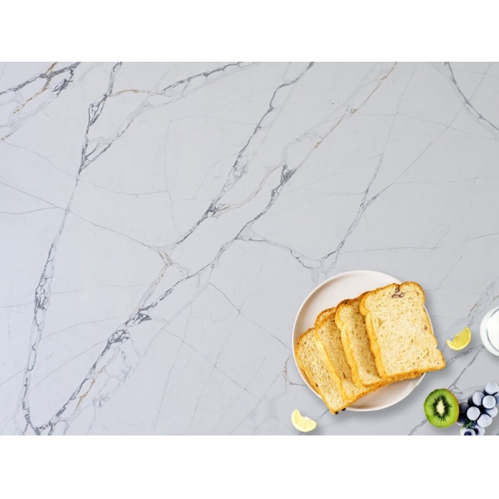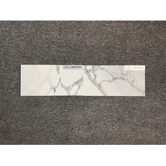 Exquisite and unique,Calacatta Quartz stuns the senses with its clean whites and striking through-body marble look veining.With its beautiful striking wide vein pattern and luxurious feel. This quartz offers the natural look of the Calacatta marble, but with none of the drawbacks that come with marble worktops. Calacatta quartz is a very durable worktop that is stain and scratch resistant meaning it is also a very practical choice for kitchen and bathroom countertops, stairs, window sills, custom furniture, interior, exterior wall and floor applications, water jet pattern and other design projects.