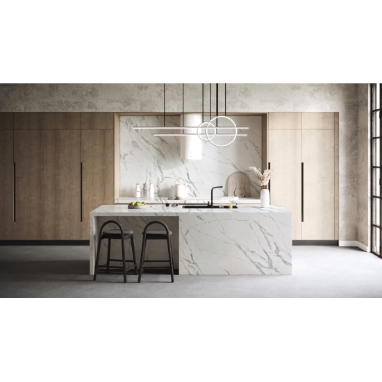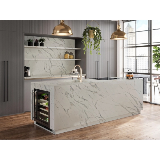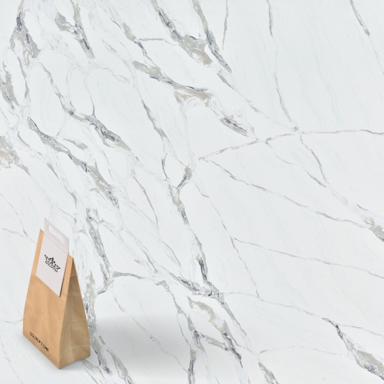 Exquisite and unique,Calacatta Quartz stuns the senses with its clean whites and striking through-body marble look veining.With its beautiful striking wide vein pattern and luxurious feel. This quartz offers the natural look of the Calacatta marble, but with none of the drawbacks that come with marble worktops. Calacatta quartz is a very durable worktop that is stain and scratch resistant meaning it is also a very practical choice for kitchen and bathroom countertops, stairs, window sills, custom furniture, interior, exterior wall and floor applications, water jet pattern and other design projects.