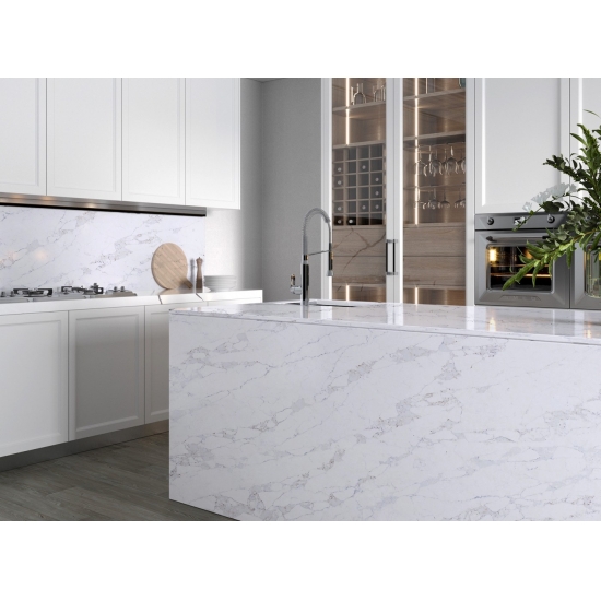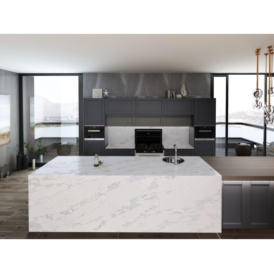 The Calacatta series quartz is currently the most popular quartz stone product.Exquisite and unique,Calacatta Quartz stuns the senses with its clean whites and striking through-body marble look veining.With its beautiful striking wide vein pattern and luxurious feel. This quartz offers the natural look of the Calacatta marble, but with none of the drawbacks that come with marble worktops. Calacatta quartz is a very durable worktop that is stain and scratch resistant meaning it is also a very practical choice for kitchen and bathroom countertops, stairs, window sills, custom furniture, interior, exterior wall and floor applications, water jet pattern and other design projects.