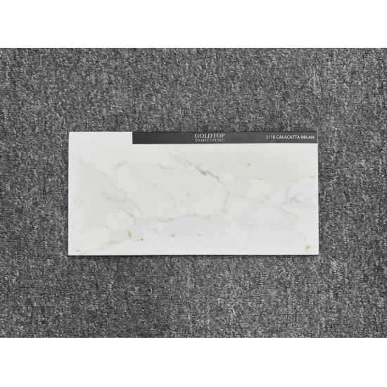 Exquisite and unique,Calacatta Quartz stuns the senses with its clean whites and striking through-body marble look veining.With its beautiful striking wide vein pattern and luxurious feel. This quartz offers the natural look of the Calacatta marble, but with none of the drawbacks that come with marble worktops. Calacatta quartz is a very durable worktop that is stain and scratch resistant meaning it is also a very practical choice for kitchen and bathroom countertops, stairs, window sills, custom furniture, interior, exterior wall and floor applications, water jet pattern and other design projects.