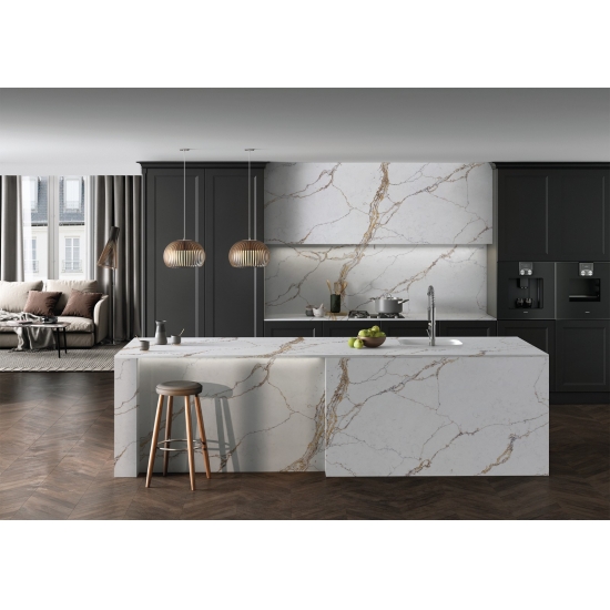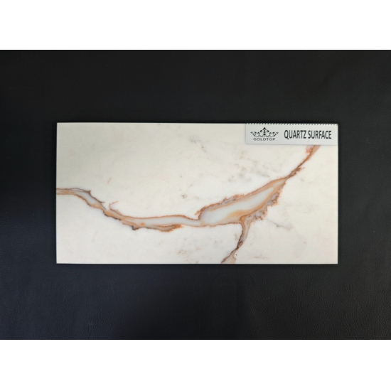 The Calacatta series quartz is currently the most popular quartz stone product.Exquisite and unique,Calacatta Quartz stuns the senses with its clean whites and striking through-body marble look veining.With its beautiful striking wide vein pattern and luxurious feel. This quartz offers the natural look of the Calacatta marble, but with none of the drawbacks that come with marble worktops. Calacatta quartz is a very durable worktop that is stain and scratch resistant meaning it is also a very practical choice for kitchen and bathroom countertops, stairs, window sills, custom furniture, interior, exterior wall and floor applications, water jet pattern and other design projects.