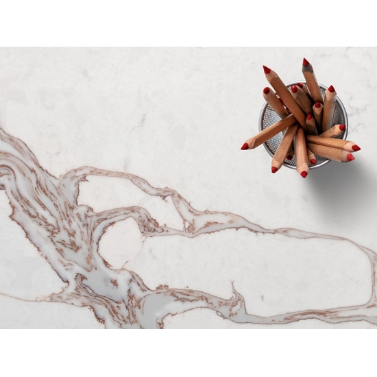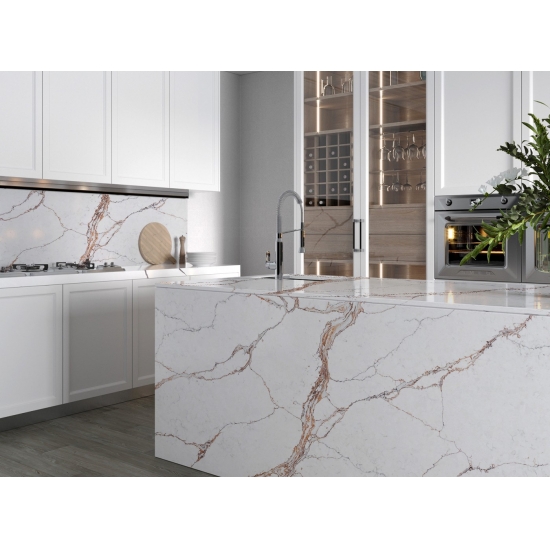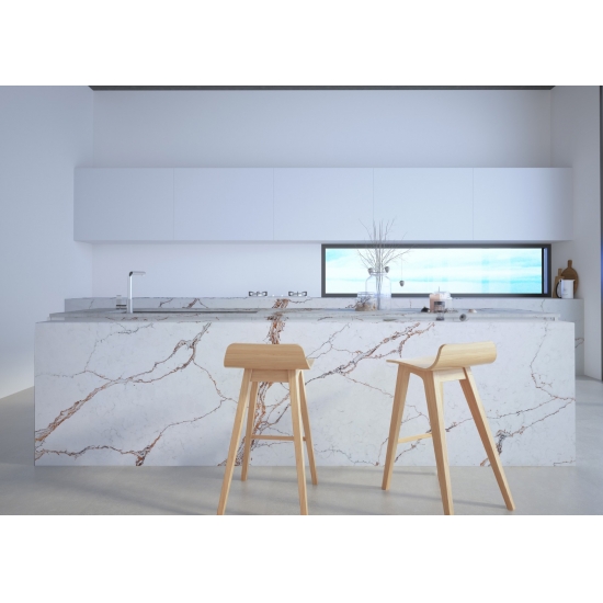 Exquisite and unique,Calacatta Quartz stuns the senses with its clean whites and striking through-body marble look veining.With its beautiful striking wide vein pattern and luxurious feel. This quartz offers the natural look of the Calacatta marble, but with none of the drawbacks that come with marble worktops. Calacatta quartz is a very durable worktop that is stain and scratch resistant meaning it is also a very practical choice for kitchen and bathroom countertops, stairs, window sills, custom furniture, interior, exterior wall and floor applications, water jet pattern and other design projects.