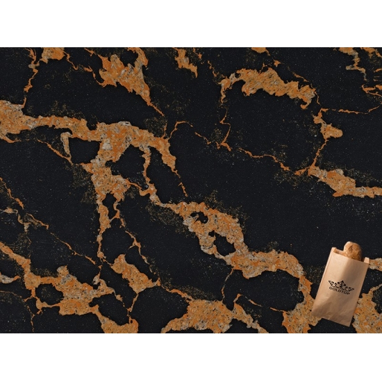 5121 Milan Extra Calacatta Gold Quartz showcases a bold, dramatic appearance with its deep black background interspersed with fine, shimmering particles. The surface exudes sophistication, as the dark tones are contrasted by subtle flecks that catch the light, creating a sense of depth and movement. This quartz is designed to make a statement, adding a touch of opulence to any space it graces.