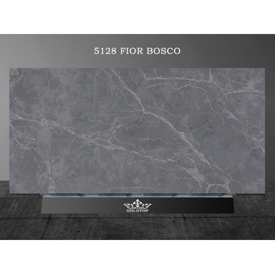 5128 Fior Bosco Quartz showcases a sophisticated gray canvas, elegantly traced with delicate, organic veining that evokes the serene beauty of a forest landscape. Each slab presents a unique composition of tonal depth and fluid movement, bringing a modern and atmospheric tranquility to any interior. Its luminous surface enhances light reflection, creating a dynamic visual flow perfect for kitchen countertops, bathroom vanities, and feature walls.