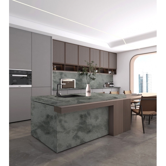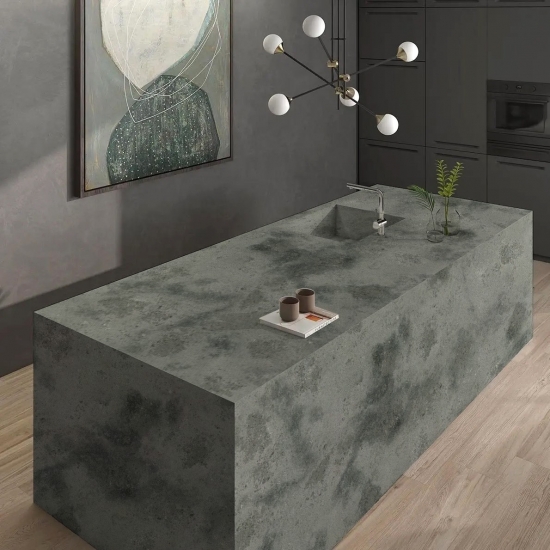 Concrete quartz is a specially treated artificial stone quartz material.It similar to a matte finish, a concrete finish will slightly alter the color of the quartz as compared to the classic polished finish. This finish is also referred to as “brushed” when referring to granite.