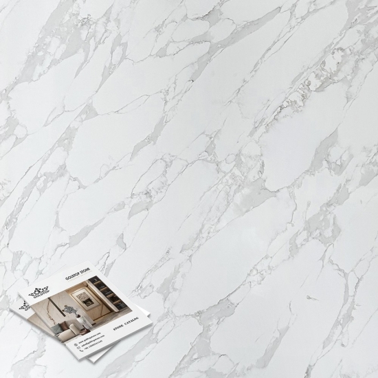 Exquisite and unique,Calacatta Quartz stuns the senses with its clean whites and striking through-body marble look veining.With its beautiful striking wide vein pattern and luxurious feel. This quartz offers the natural look of the Calacatta marble, but with none of the drawbacks that come with marble worktops. Calacatta quartz is a very durable worktop that is stain and scratch resistant meaning it is also a very practical choice for kitchen and bathroom countertops, stairs, window sills, custom furniture, interior, exterior wall and floor applications, water jet pattern and other design projects.
