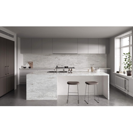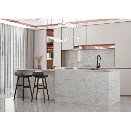 6035 Concrete Blanc is a stone with a modern appeal, showcasing a concrete-like texture but with a more refined and smooth surface. Its color is a bright white with subtle gray undertones, giving it a clean and sophisticated look. This stone is ideal for contemporary home decor, especially in kitchens and bathrooms, adding a sleek and stylish touch to any space.
