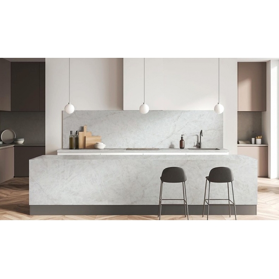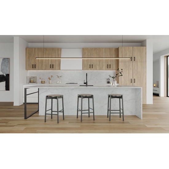 Cristallo Printed Quartz is an engineered stone inspired by the rare natural quartzite, meticulously replicating the iconic beauty of Cristallo quartzite. It features a luminous icy white background adorned with delicate gray veining and vibrant orange crystalline flecks, creating a soft, translucent glow under light for an ethereal and luxurious ambiance.